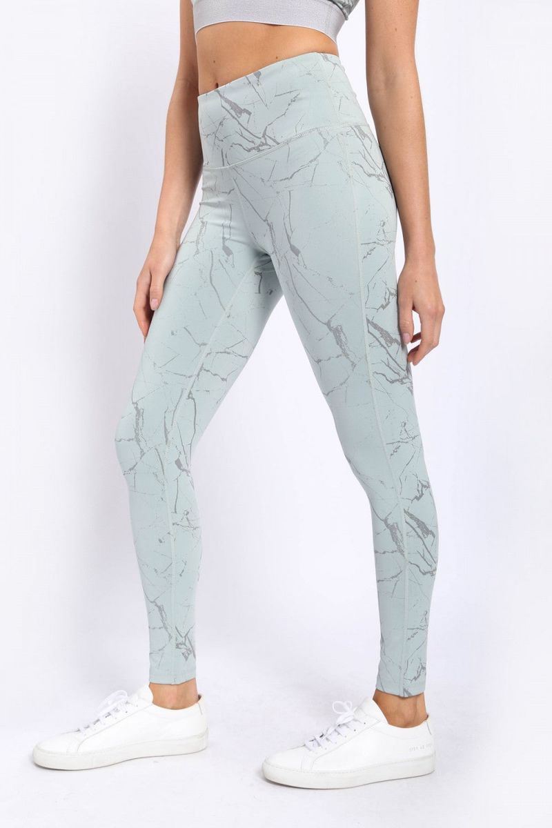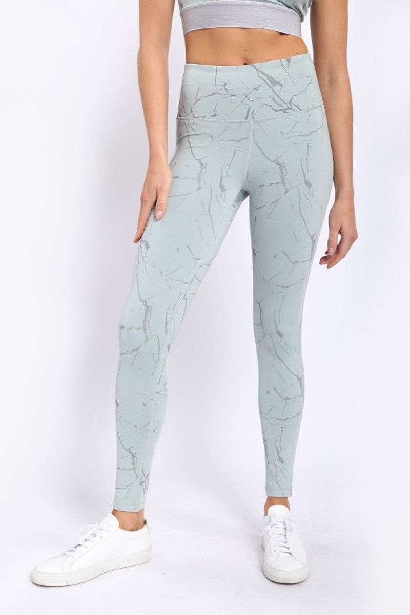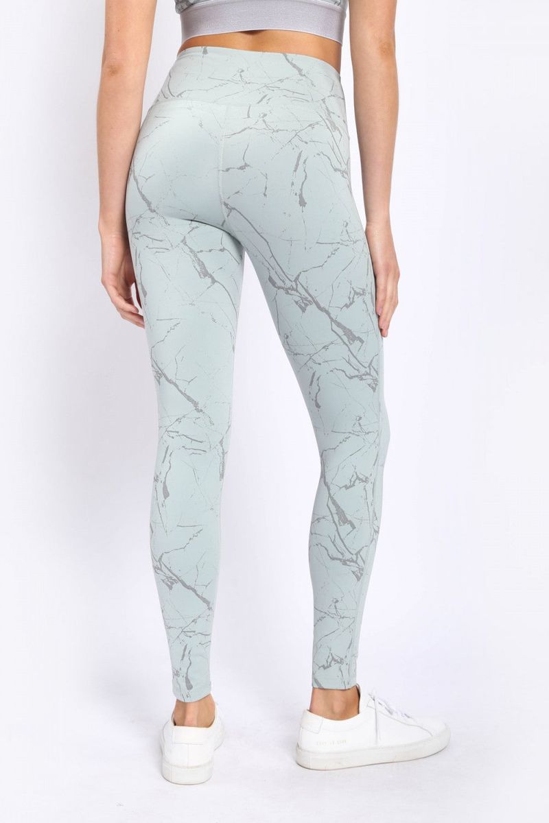 This subtle pair of leggings was constructed from a solid-colored, polyester-spandex fabric and overlaid with a foil print for a stoic, marble look.