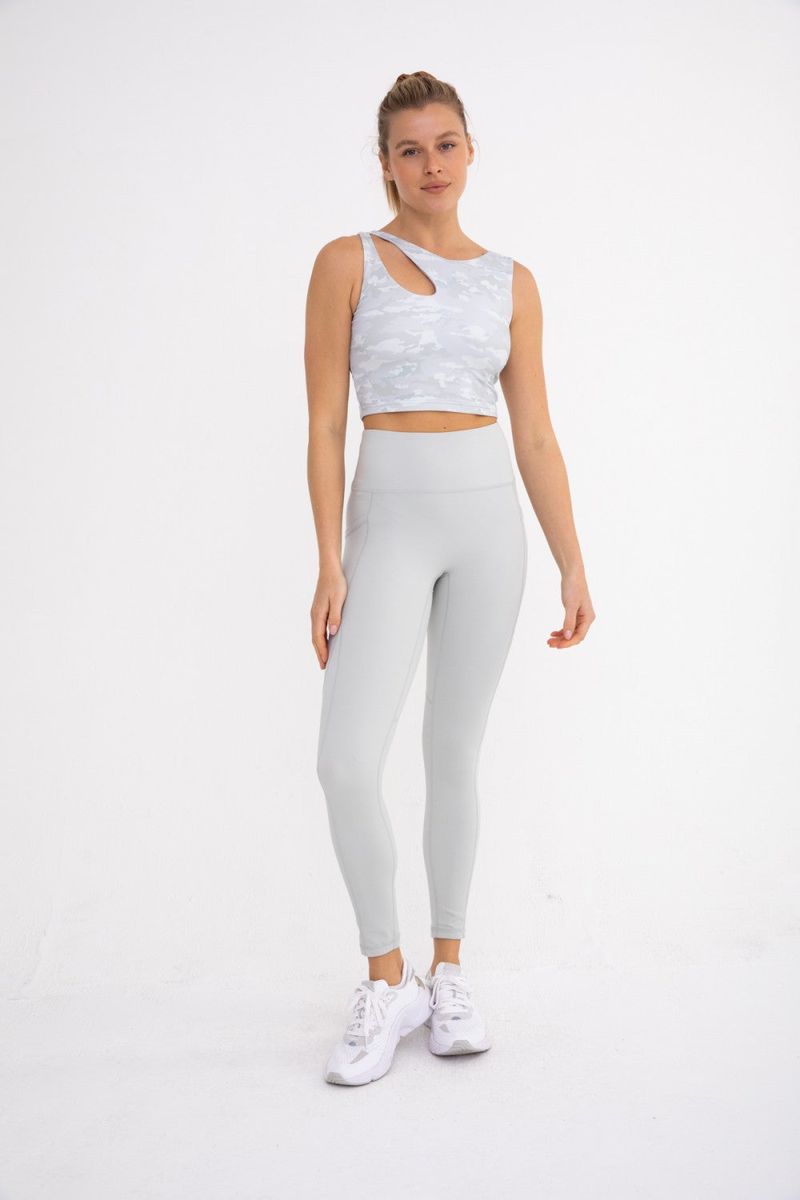 Elevate your workout attire. This asymmetrical sports bra features a cut-out at the wearers right strap, a subtle camouflage print, is fully lined, wider straps for extra support, and a longer length for additional coverage.