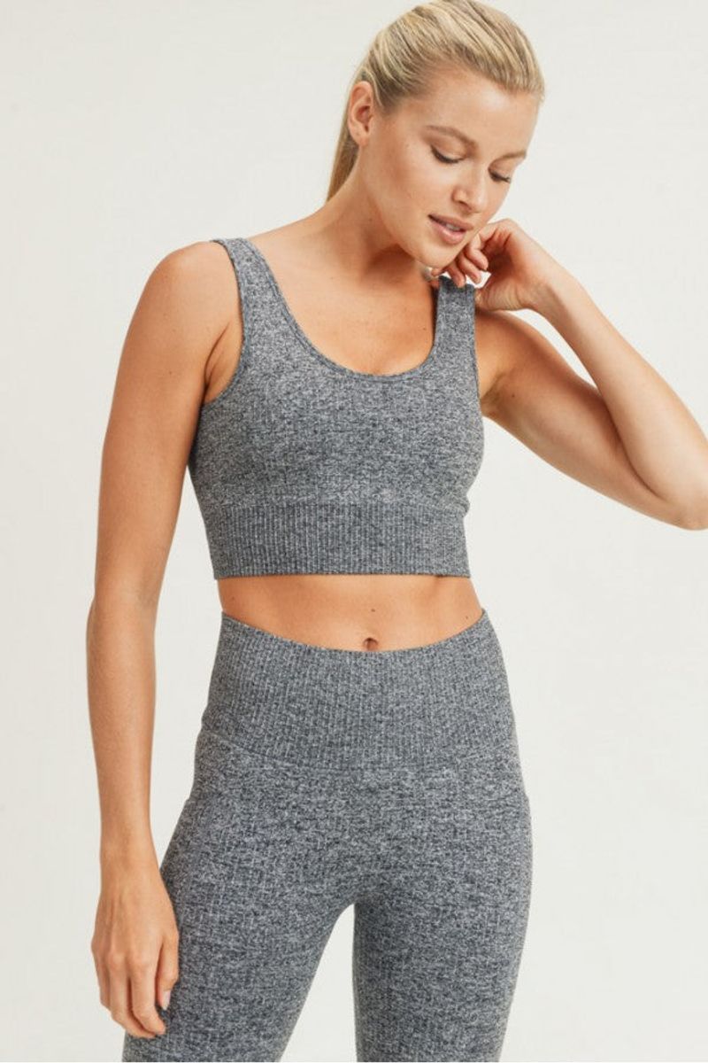 This seamless sports bra has a classic cut with a scoop rounded neckline on the back and a ribbed him that gives more coverage in the mid-section.