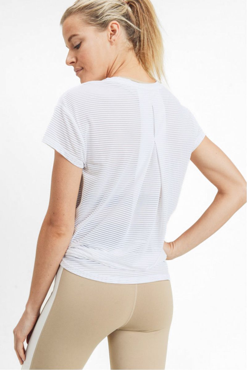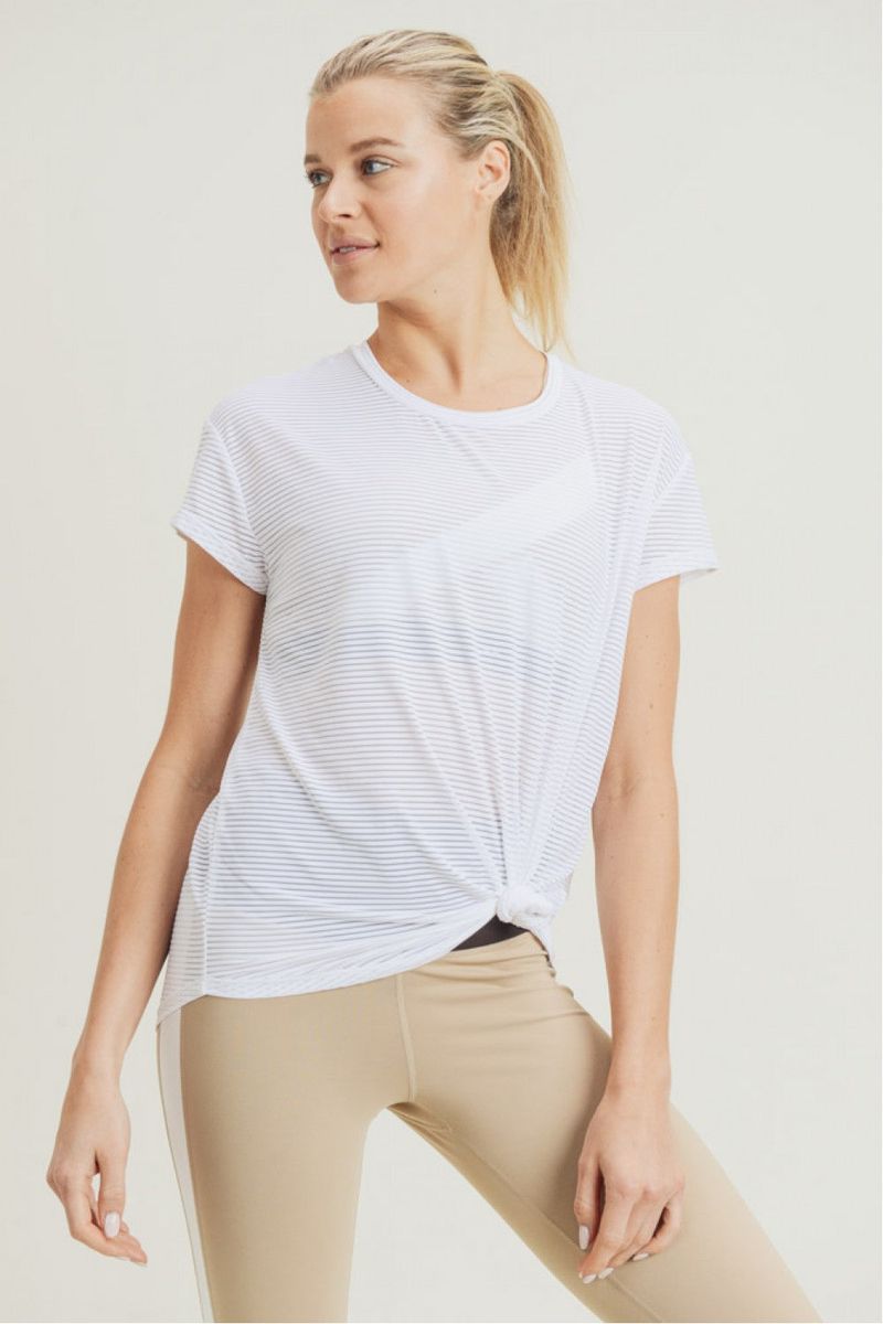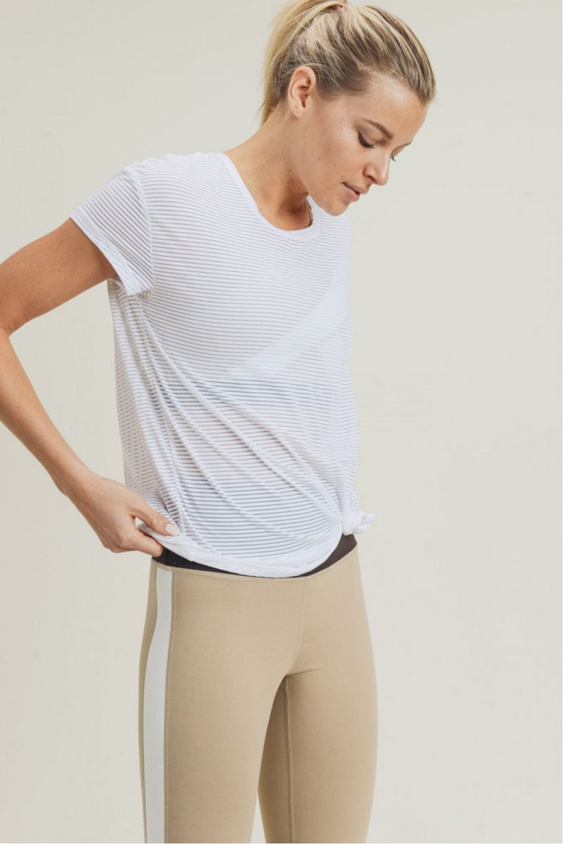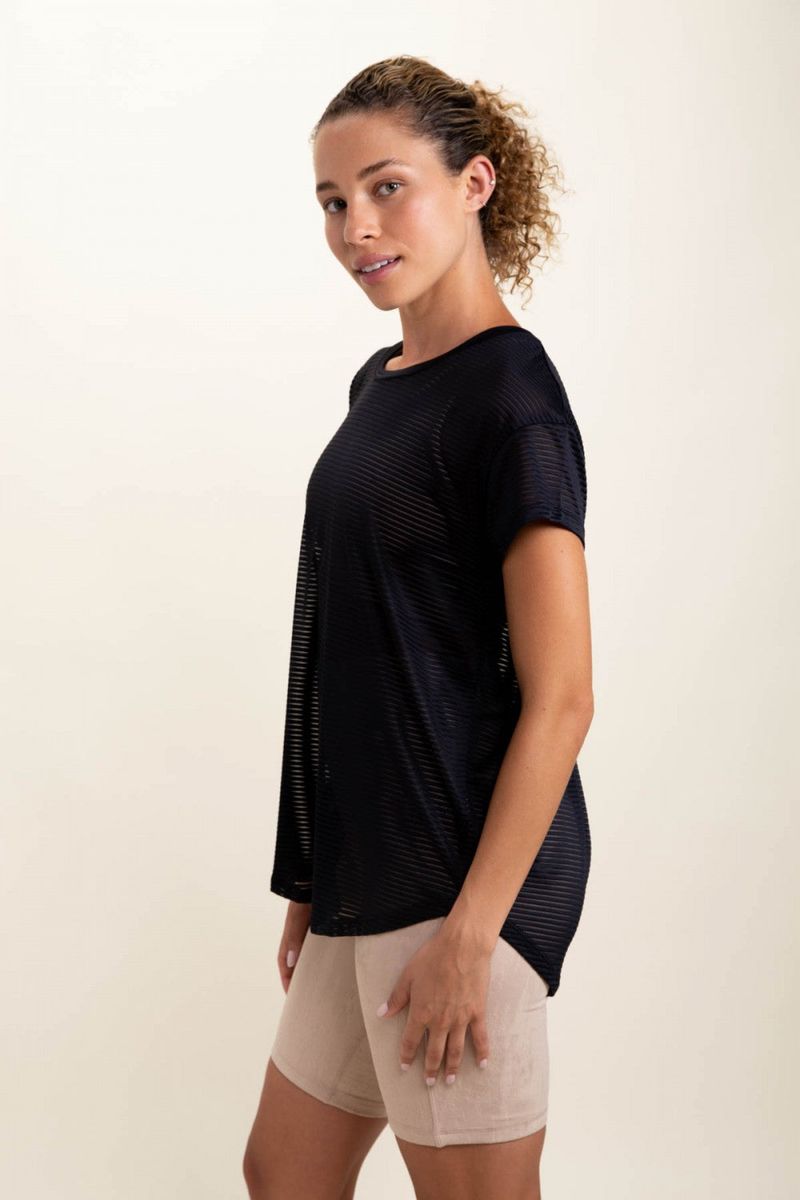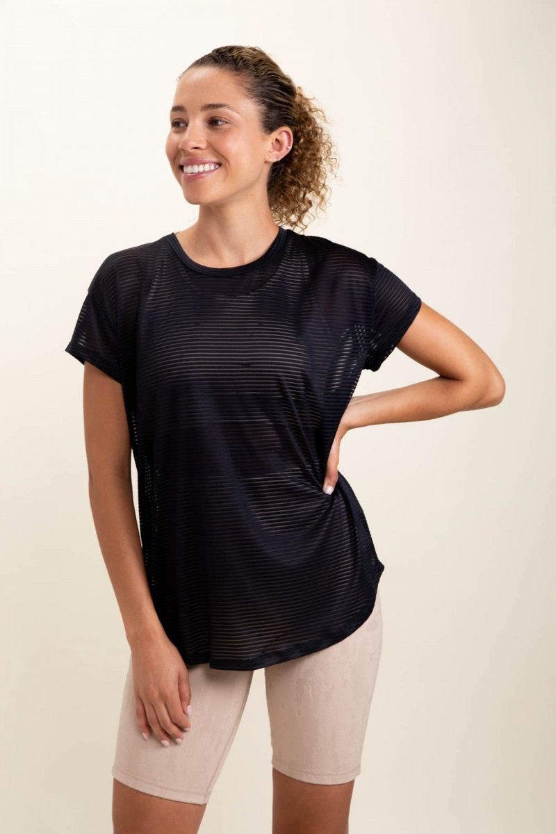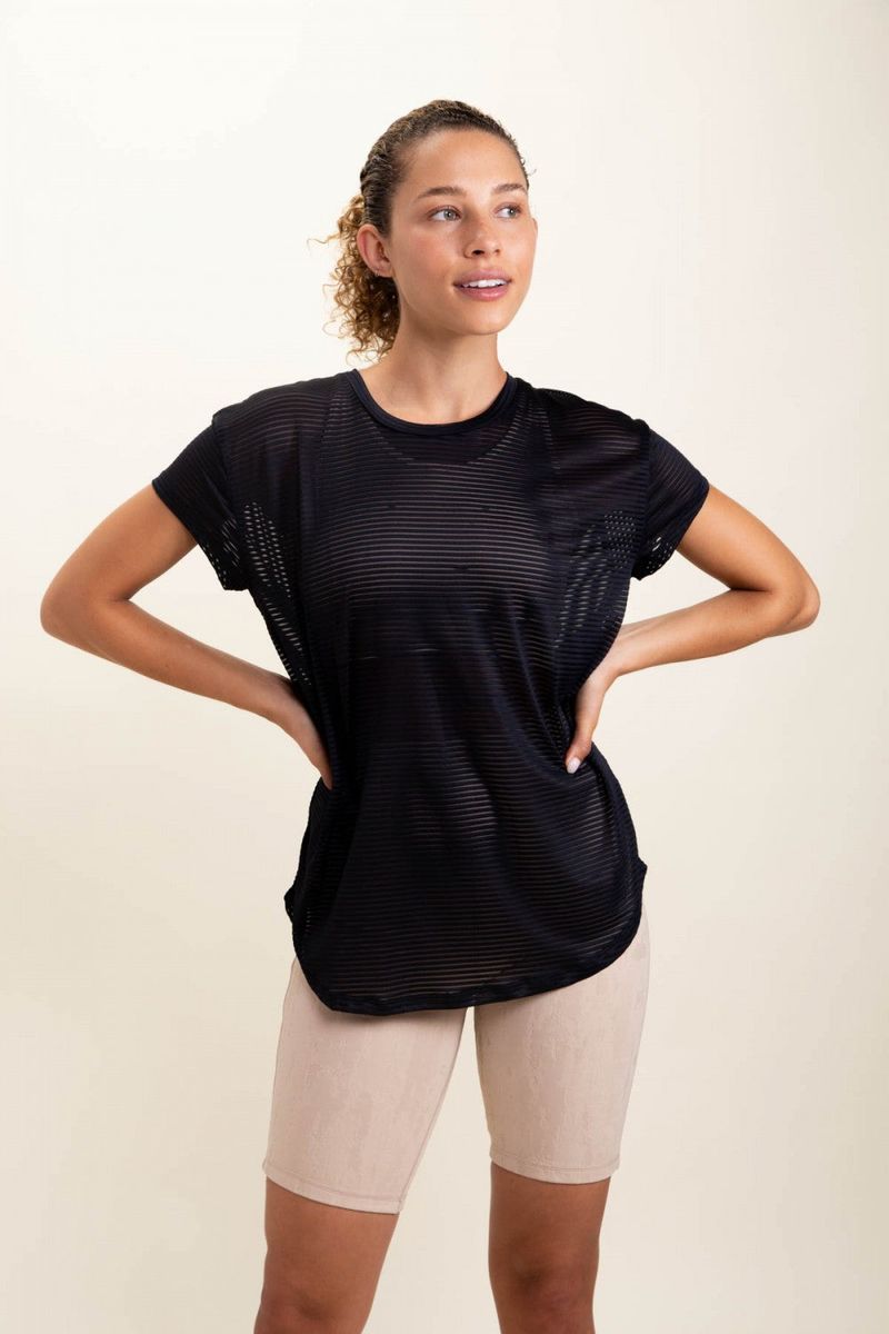 Constructed using feather-light, striped-mesh fabric in nylon-spandex blend, this tee features cap sleeves, a rounded neckline, as well as double pinches on the back for a subtle drape effect.