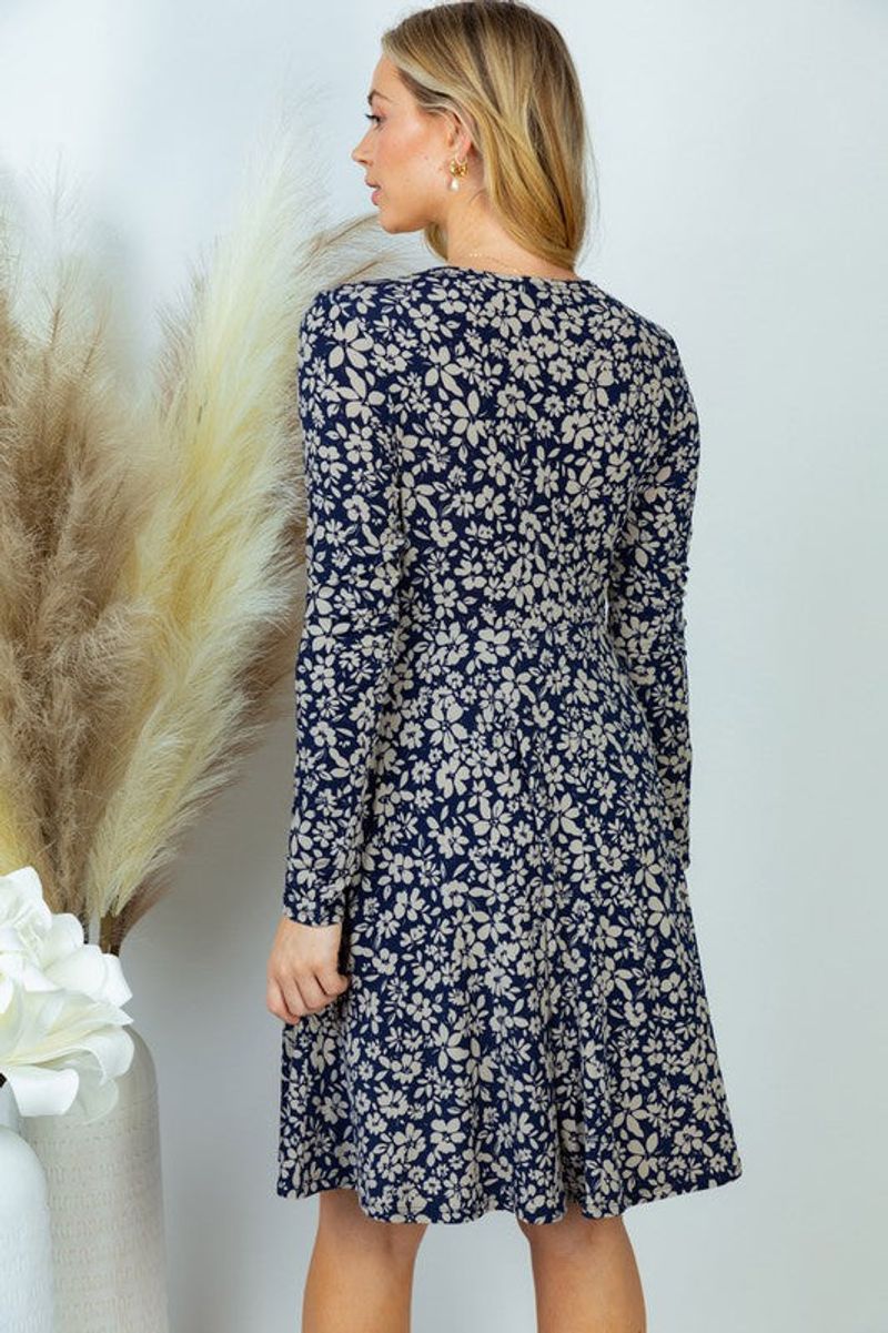 A long sleeve floral print knit dress with a surplice front featuring side pockets and a true-to-size fit. Fabric is a lightweight knit.