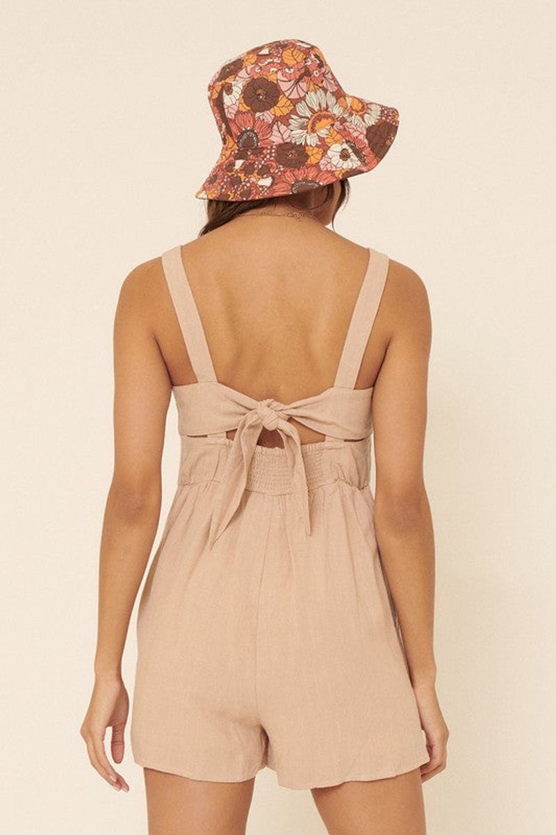 This romper features a flattering sweetheart neckline, tank straps, and a twist-front bodice with button front closure for a secure fit and comfortable feel. The back tie detail ensures a relaxed fit and perfect silhouette. Durable woven fabric adds breathability and easy care.